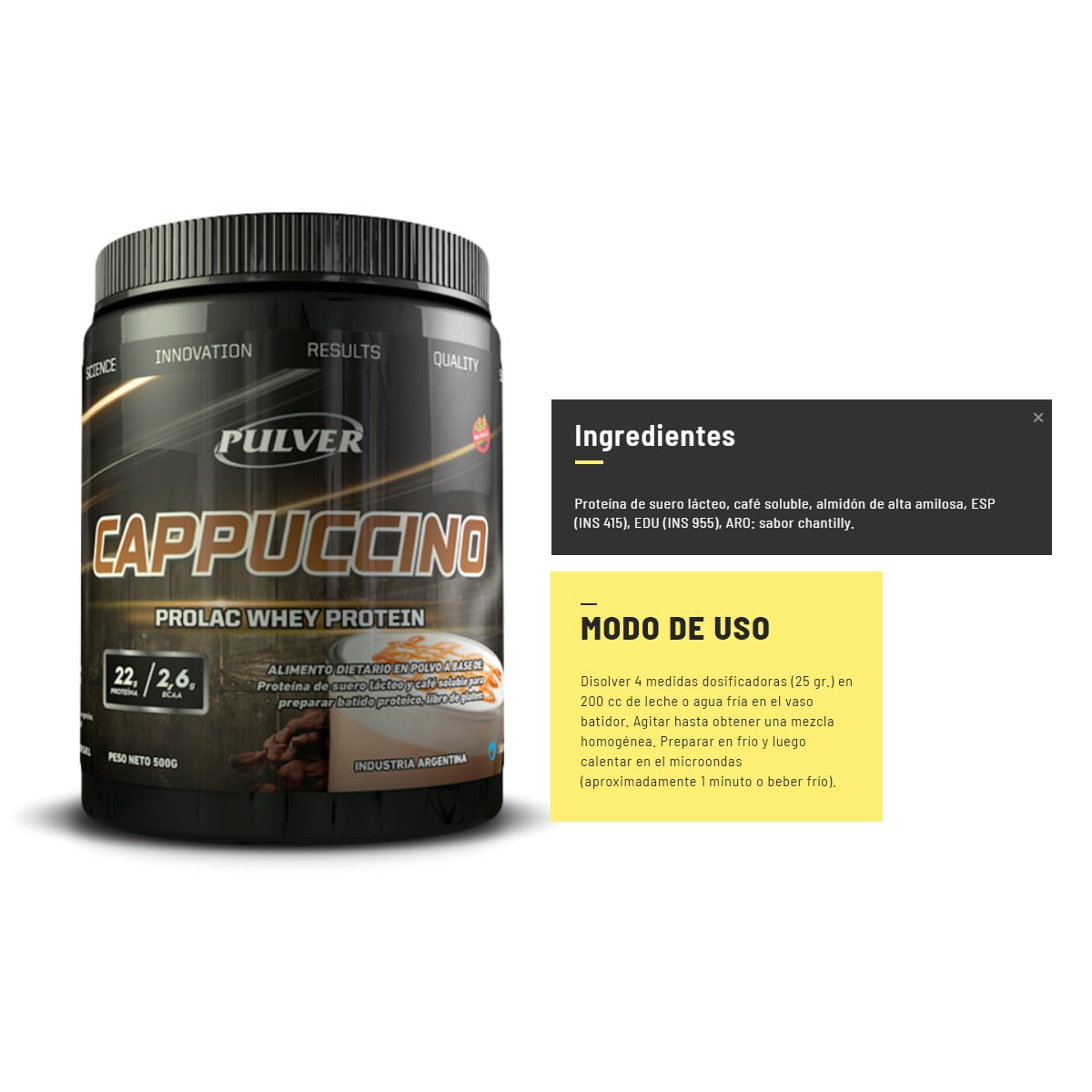 Prolac Whey Protein 500 grs sabor a Cappuccino. Ideal para comenzar tu día. Recuperación y rendimiento son sus beneficios principales.